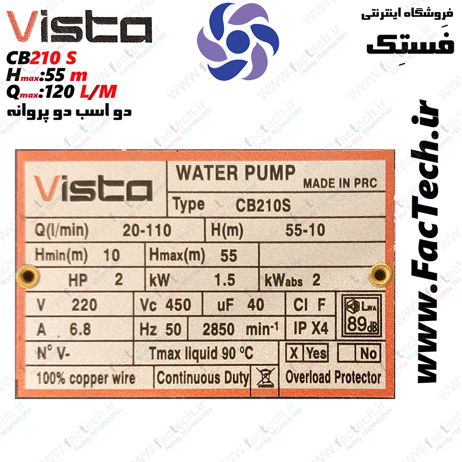 پمپ دو اسب دو پروانه ویستا - cb210S - پروانه استیل سیم مسی شفت استیل گارانتی یکساله
